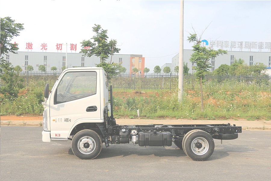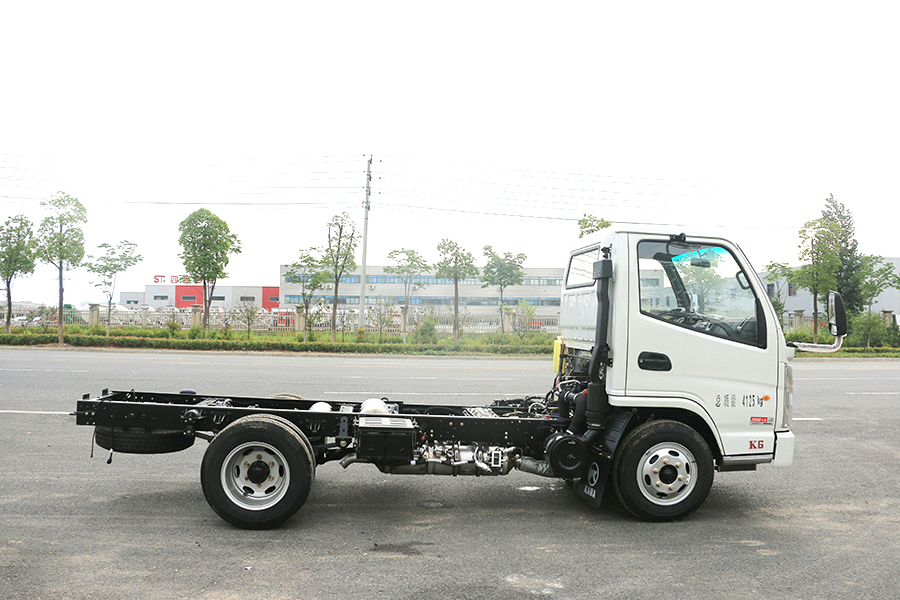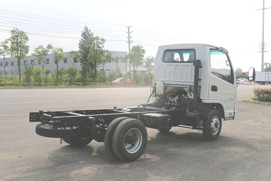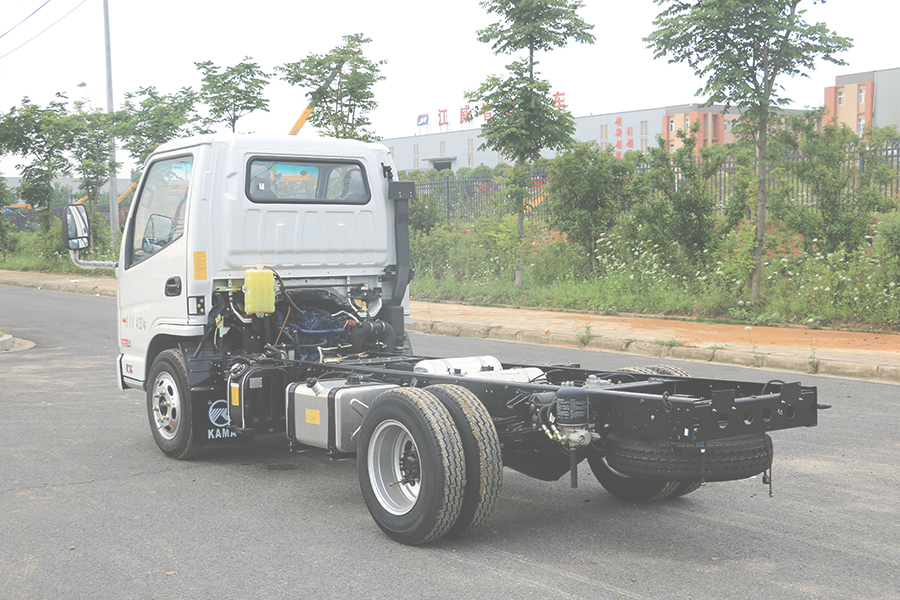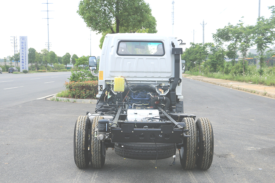 直通大梁厚度180mm,截面寬度800mm,斷面整潔布局合理,易改裝。 全鋁合金燃油油箱和儲氣罐,輕量化設計,鋼板彈簧10mm厚,片數5+4,后橋加重型號1046BQS(3.5噸),高質量工藝,承重性好。