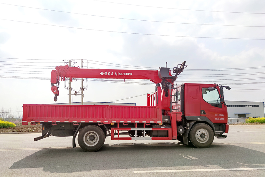 隨車吊的直臂吊機是安裝在駕駛室與車廂之間。車輛作業時,從駕駛室的變速箱中取力,帶動液壓泵旋轉。向各元件提供高壓油,從而實現直臂吊機在隨車吊上做各種方位的運動。